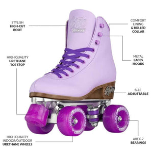 Pre-fitted with signature outdoor wheels, measuring 62mm with a rounded edge and 78a durometer, these skates ensure great performance. The wheels are precisely spaced and paired with ABEC 7 Chrome Steel Bearings, offering efficiency and protection from dust, debris, and moisture. The glitter-infused wheels add a sparkling touch to your skating experience.