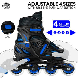 FOUR SIZE ADJUSTABLE | Perfect for growing feet – simply press a button and slide to adjust the skate across four (4) different sizes.