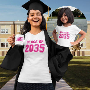 Just let us know the colour of text and the year you would like on the t-shirt.  There are 13 years of school in Australia and New Zealand, so to work out the year they will graduate high school, just add 12 to the start year.  Fingers crossed, if your child started school in 2023, they should graduate high school in 2035.  If they start school in 2025, they should graduate high school in 2037.
